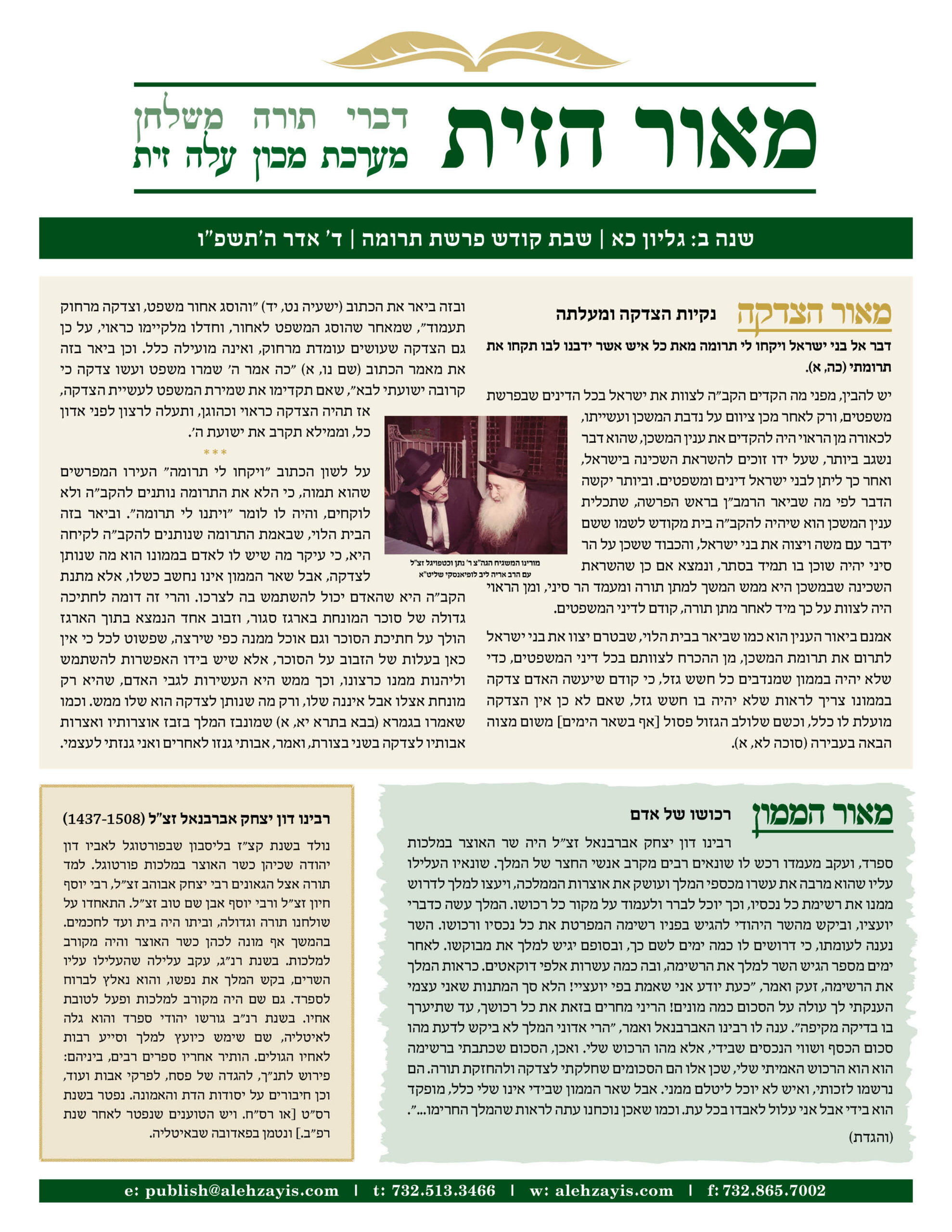 ובזה ביאר את הכתוב (ישעיה נט, יד) “והוסג אחור משפט, וצדקה מרחוק תעמוד”, שמאחר שהוסג המשפט לאחור, וחדלו מלקיימו כראוי, על כן גם הצדקה שעושים עומדת מרחוק, ואינה מועילה כלל. וכן ביאר בזה את מאמר הכתוב (שם נו, א) “כה אמר ה’ שמרו משפט ועשו צדקה כי קרובה ישועתי לבא”, שאם תקדימו את שמירת המשפט לעשיית הצדקה, אז תהיה הצדקה כראוי וכהוגן, ותעלה לרצון לפני אדון כל, וממילא תקרב את ישועת ה’.
