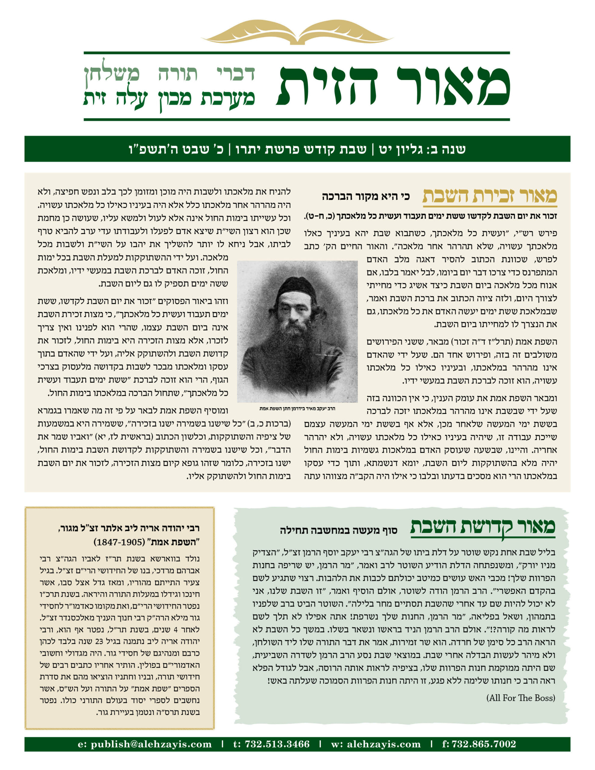 וזהו ביאור הפסוקים “זכור את יום השבת לקדשו, ששת ימים תעבוד ועשית כל מלאכתך”, כי מצות זכירת השבת אינה ביום השבת עצמו, שהרי הוא לפנינו ואין צריך לזכרו, אלא מצות הזכירה היא בימות החול, לזכור את קדושת השבת ולהשתוקק אליה, ועל ידי שהאדם בתוך עסקו ומלאכתו מבכר לשבות בקדושה מלעסוק בצרכי הגוף, הרי הוא זוכה לברכת “ששת ימים תעבוד ועשית כל מלאכתך”, שתחול הברכה במלאכתו בימות החול.